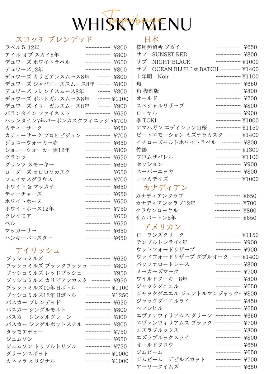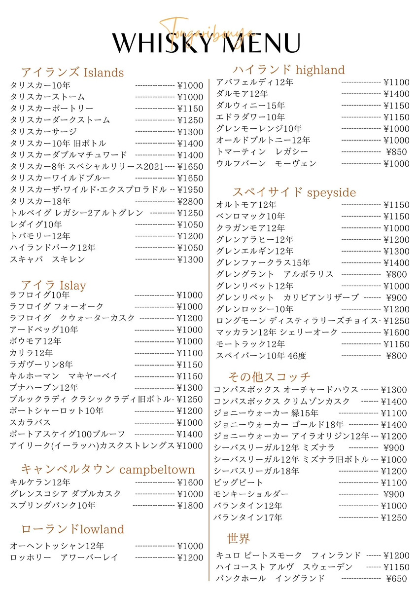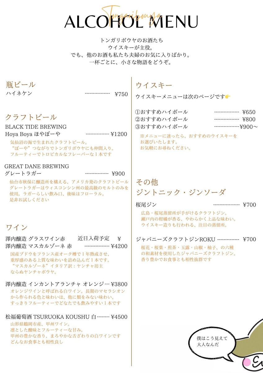 ランチでもディナーでも気軽に楽しめる、トンガリボウヤ自慢のアルコールメニューへようこそ。当店では、150種類以上のウイスキーをご用意しています。ウイスキーの奥深い魅力を、もっと多くの方に知ってほしい――そんな思いから、ウイスキーを愛し本も出版しているマスターが、自らの舌で選び抜いた一本を揃えました。一杯のウイスキーから始まる、新たな冒険をぜひお楽しみください。